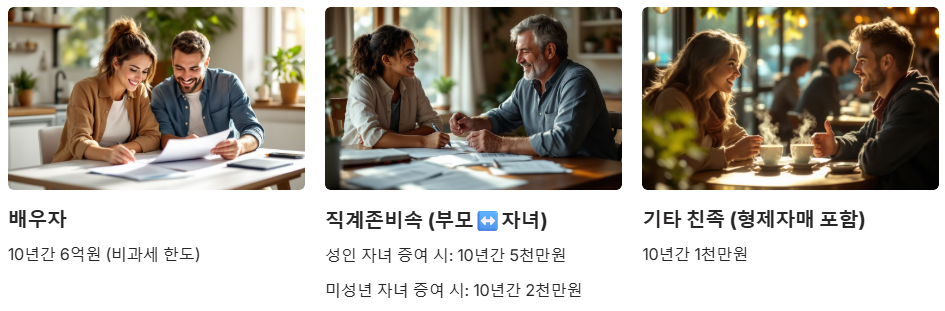 • 형제자매·기타 친족: 10년간 1천만 원까지 비과세
