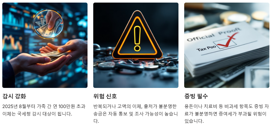 📌 가족 간 이체, 세무조사로 뒤늦게 후회하지 마세요! 한도 내 분할 이체, 명확한 기록이 필수입니다.