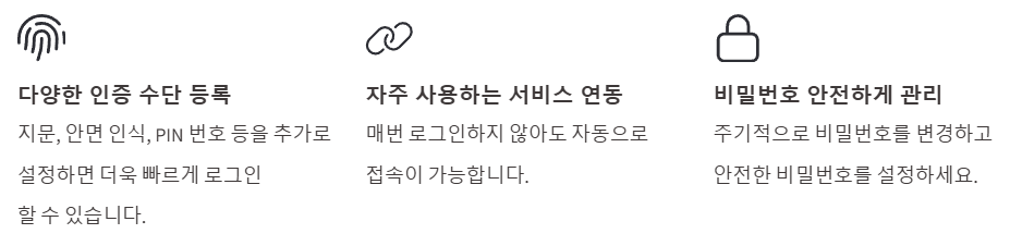 - 지문, 안면 인식, PIN 번호 등을 추가로 설정하면 더욱 빠르게 로그인 가능!