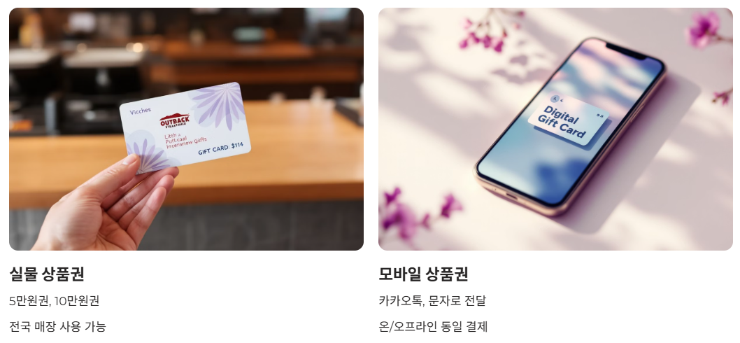 아웃백 상품권은 대표적으로 시그니처 기프트 카드(실물카드)와 모바일 금액권 두 가지가 있습니다.