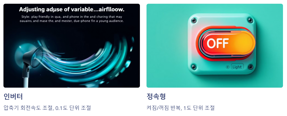 - 인버터: 조용하고 절전, 섬세한 온도조절, 초기 구입가 높음