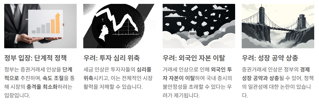 - 정부는 증권거래세율을 한꺼번에 올리기보다는 단계적 인상, 속도 조절 등 시장 충격 최소화를 고려하고 있습니다.