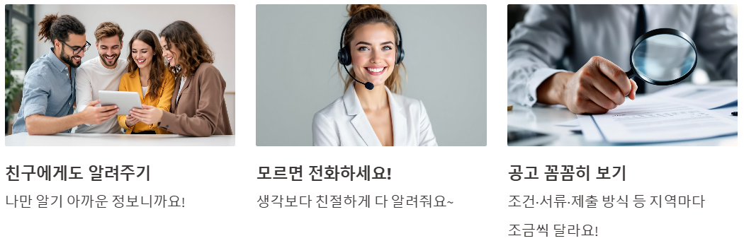 • 공고 꼼꼼히 보기: 조건·서류·제출 방식 등 지역마다 조금씩 달라요!