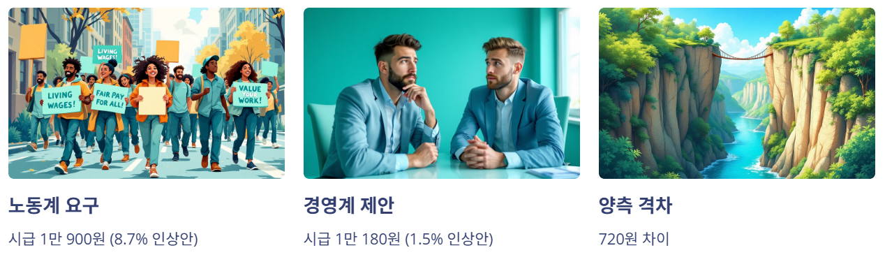 올해 최저임금 심의는 그야말로 한 치 양보 없는 줄다리기입니다. 노동계(근로자 측)현행보다 8.7% 인상된 시급 1만 900원을 요구했고, 경영계(사용자 측)1.5% 오른 1만 180원을 제시했습니다. 그 사이의 격차는 720원. 숫자로 보면 별 것 아닌 것 같지만, 경제 현장에서는 천지개벽만큼 큰 차이일 수밖에 없죠.