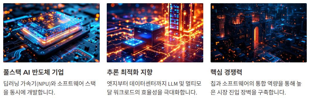 퓨리오사AI는 딥러닝 가속기(NPU)와 소프트웨어 스택을 함께 개발하는 풀스택 AI 반도체 기업입니다. 엣지부터 데이터센터까지 이어지는 추론(Serving) 최적화를 지향하며, 대형 언어모델(LLM)·멀티모달 워크로드에서 효율성과 비용 경쟁력을 내세웁니다. 국내외 빅테크와의 협력, 콘소시엄 참여를 통해 레퍼런스를 차곡차곡 쌓아가고 있습니다.