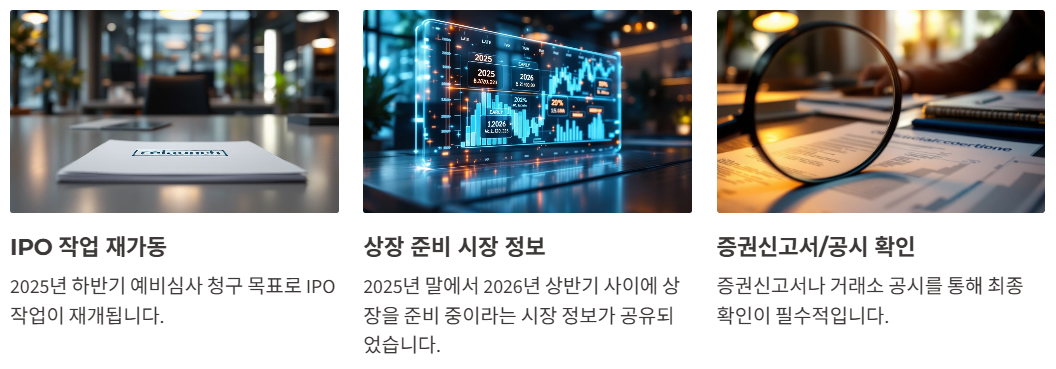“아, 일정은 바뀔 수 있습니다.” 기술 검증·대형 고객 계약 진척, 시장 컨디션(공모주 수요)이 IPO 타이밍을 좌우합니다. 예비심사 청구 공시가 나오는지부터 챙겨보세요.