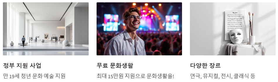 👉 청년 문화 예술 패스 공식 홈페이지 또는 거주 지역 지방자치단체 홈페이지에서 확인 가능합니다.