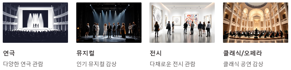 - 연극, 뮤지컬, 전시, 클래식, 오페라 등 다양한 장르 포함