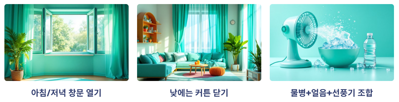 - 아침/저녁 창문 열기, 낮에는 커튼 꼭 닫기 – 실내온도 2~3도 추가로 낮출 수 있습니다.