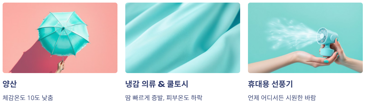 냉감 의류와 쿨토시는 땀을 빠르게 증발시켜 피부 온도를 낮춥니다. 마치 에어컨을 입은 듯, 피부에 닿자마자 시원함이 퍼지는 냉감 기능성 소재가 폭염 속 출·퇴근, 등산, 야외 활동에서 확실한 생존 도구로 통합니다.