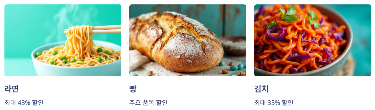 특히 라면, 빵, 김치는 국민 간식, 밥상 필수템인 만큼 할인에 체감 효과가 큰 품목입니다.
