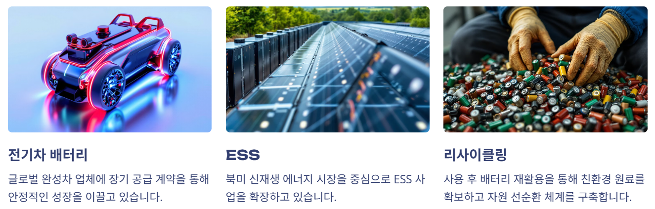 - 전기차 배터리: 글로벌 완성차 업체들과 전략적 장기 공급 계약, 미국·유럽 진출 및 현지화 가속.